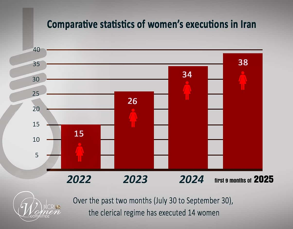 In this unprecedented wave of executions, the regime has not only broken its own records for executing women but has also increased the total number of executions each month. In 2022, the total number of executions in Iran was about 578; in 2023, 850; in 2024, 1,001; and in just the first 9 months of 2025, around 1,175 people have been executed.